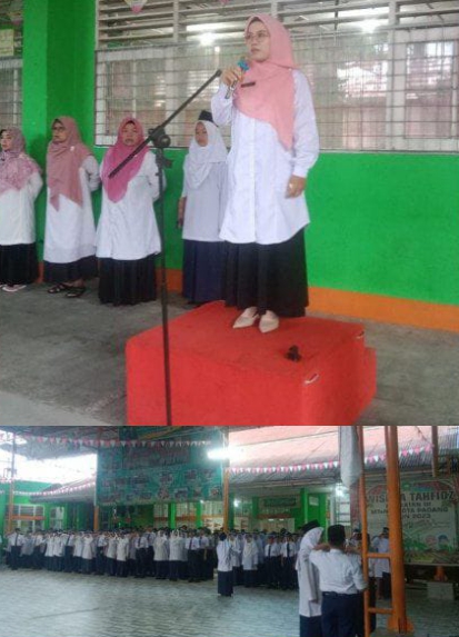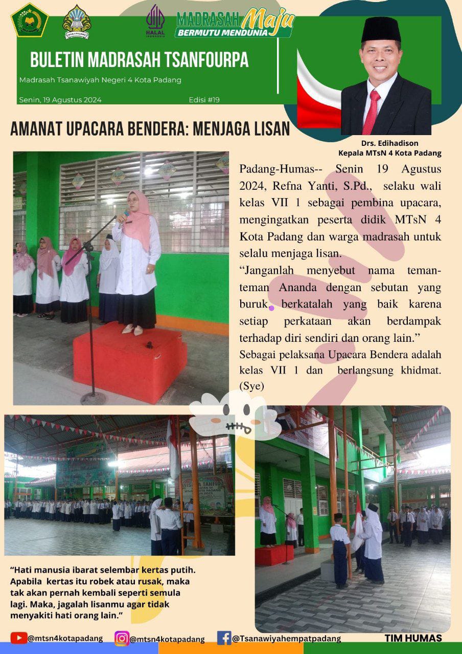 Padang-Humas-- Senin 19 Agustus 2024, Refna Yanti, S.Pd., selaku wali kelas VII.1 sebagai pembina upacara, mengingatkan peserta didik MTsN 4 Kota Padang dan warga madrasah untuk selalu menjaga lisan. "Janganlah menyebut nama teman-teman Ananda dengan sebutan yang buruk. berkatalah yang baik karena setiap perkataan akan berdampak terhadap diri sendiri dan orang lain." Sebagai pelaksana Upacara Bendera adalah kelas VII 1 dan berlangsung khidmat. (Sye)