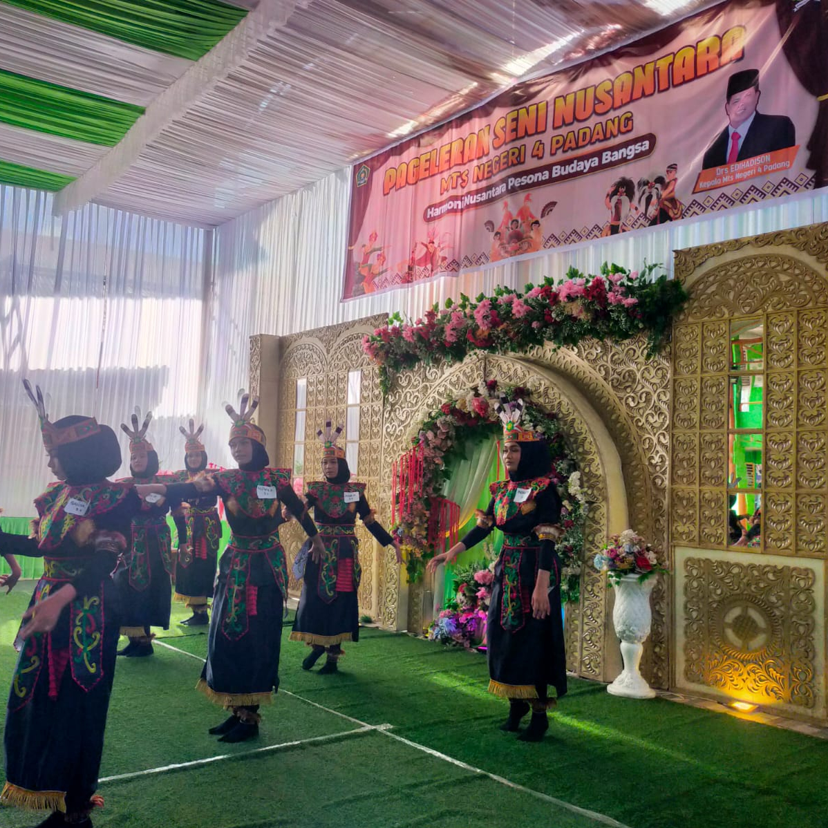 Padang, Humas — Suasana MTsN 4 Kota Padang tampak semarak dan penuh keceriaan pada Sabtu pagi (10/01/2026) dengan digelarnya Pagelaran Seni Siswa Kelas IX. Kegiatan yang berlangsung di halaman serba guna madrasah ini menjelma menjadi panggung megah bagi kreativitas siswa. Keindahan acara semakin terasa dengan dekorasi serta pernak-pernik bernuansa seni Nusantara yang menghiasi setiap sudut lokasi pagelaran.