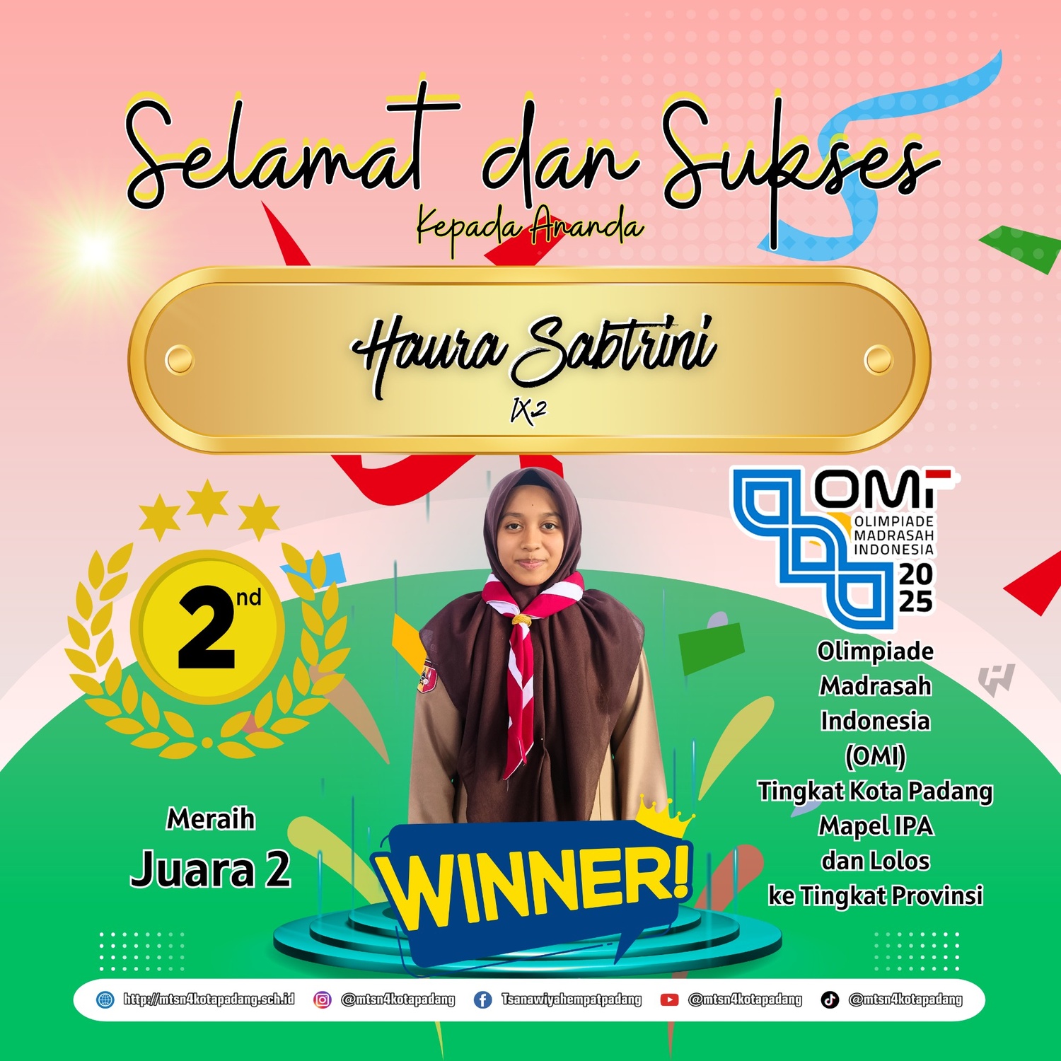 Padang – Humas: Prestasi kembali ditorehkan oleh peserta didik MTsN 4 Kota Padang. Kali ini, Haura Sabtrini berhasil mengharumkan nama madrasah dan berhasil menduduki posisi kedua OMI tingkat Kota dan lanjut ke tingkat provinsi pada ajang Olimpiade Madrasah Indonesia (OMI) bidang Sains IPA.