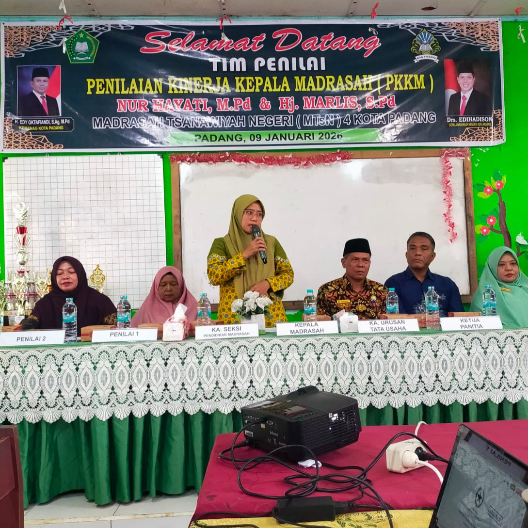 Padang, Humas --- MTsN 4 Kota Padang melaksanakan kegiatan Penilaian Kinerja Kepala Madrasah (PKKM) pada Jum'at, 09 Januari 2025. Kegiatan yang berlangsung di lingkungan MTsN 4 Kota Padang ini dimulai pukul 09.00 WIB dan berjalan tertib tanpa mengganggu proses belajar mengajar (PBM).