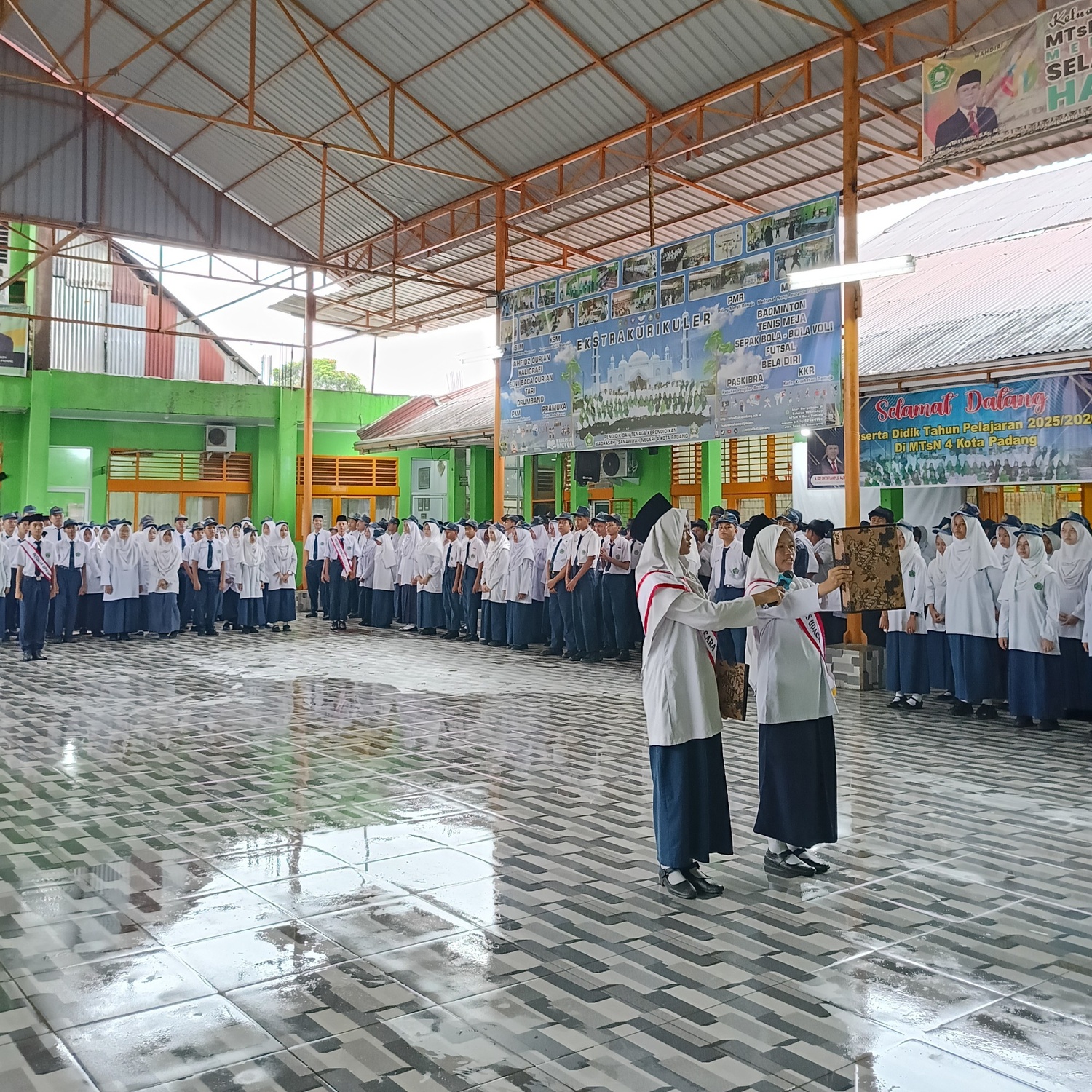 Padang, Humas — Upacara bendera terakhir di penghujung Semester Ganjil Tahun Pelajaran 2025/2026 berlangsung dengan khidmat pada Senin (24/11/2025) di halaman serbaguna madrasah. Meski Kota Padang diguyur hujan sejak dua minggu terakhir sehingga menyebabkan beberapa bagian halaman tergenang dan licin, kegiatan tetap berjalan lancar. Hal ini berkat kesiapsiagaan tim kebersihan madrasah yang sigap memastikan area upacara aman dan layak digunakan.