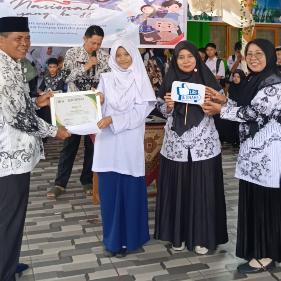 Padang, Humas — Puncak peringatan Hari Guru Nasional (HGN) tahun 2025 di MTsN 4 Kota Padang berlangsung meriah dan penuh antusiasme. Bertempat di halaman serbaguna madrasah pada Selasa (25/11/2025), pihak madrasah melalui Wakil Kepala Madrasah Bidang Humas, Rinaldi, secara resmi mengumumkan para pemenang Lomba Video P5RA antar kelas dengan tema Rekayasa Teknologi Pembuatan Sabun Cuci Piring Cair.
